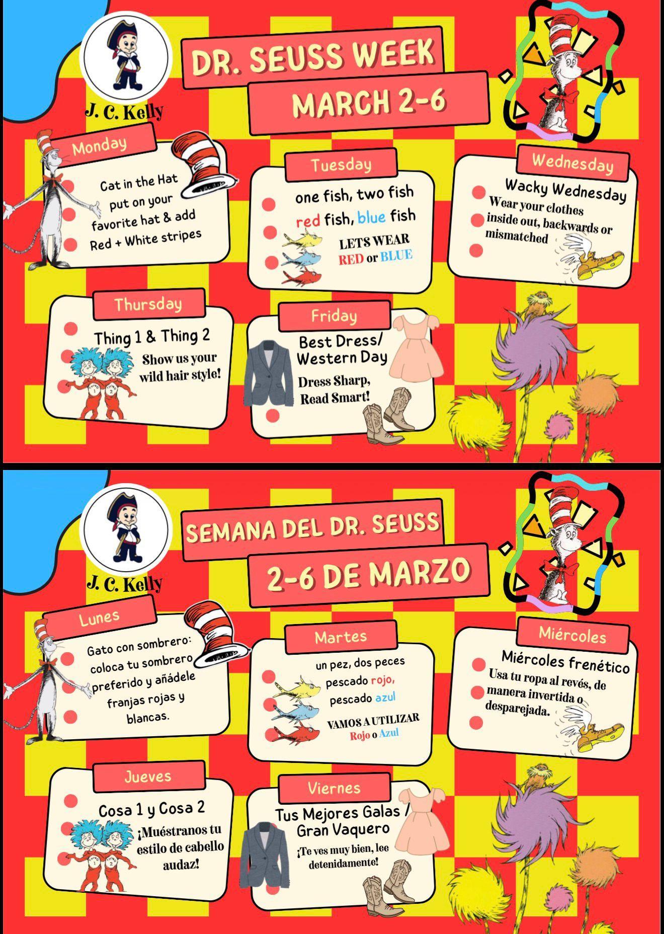 Read Across America March 2-6th/ Leyendo A través de América 2-6 de marzo Join us in celebrating and nurturing the love for reading by participating in this event. (Participation is optional. Those not participating may continue with regular uniform.)